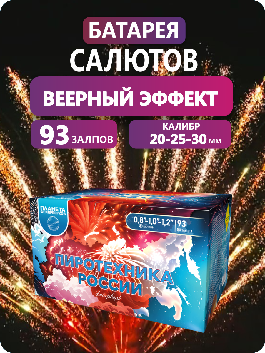 Салют веерный, 93 залпа , калибр 0,8"- 1,0"-1,2";; высота разрыва до 40м;время работы до 65сек.;10 эффектов;