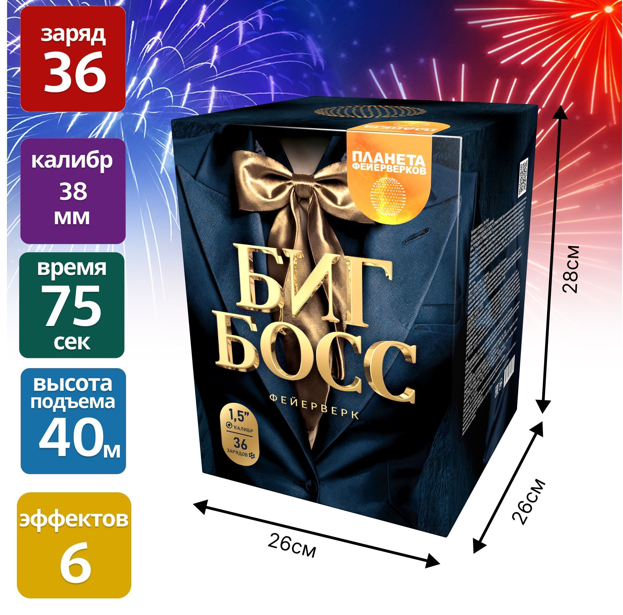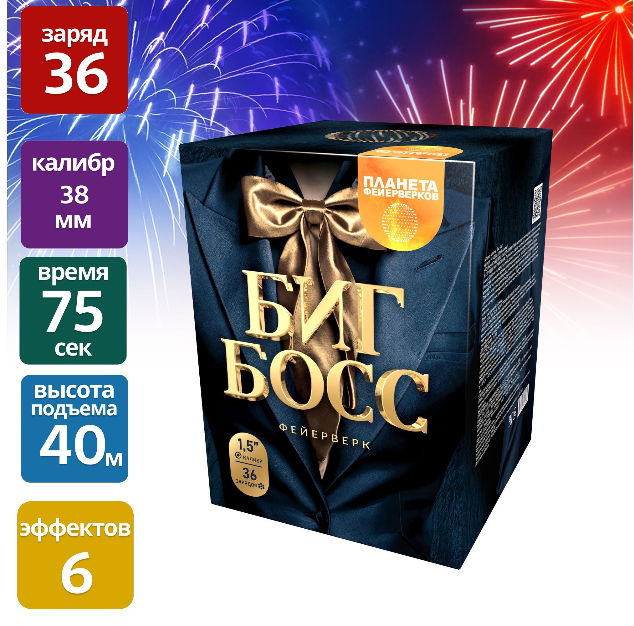 Готовы к взрыву эмоций? "Биг Босс" – это не просто фейерверк, это настоящее небесное шоу! 36 залпов калибром 1,5 дюйма взлетят на головокружительную высоту до 40 метров, а вы будете завороженно наблюдать за этим великолепием целых 75 секунд. 6 уникальных эффектов превратят ваш праздник в сказку, оставив самые яркие воспоминания!