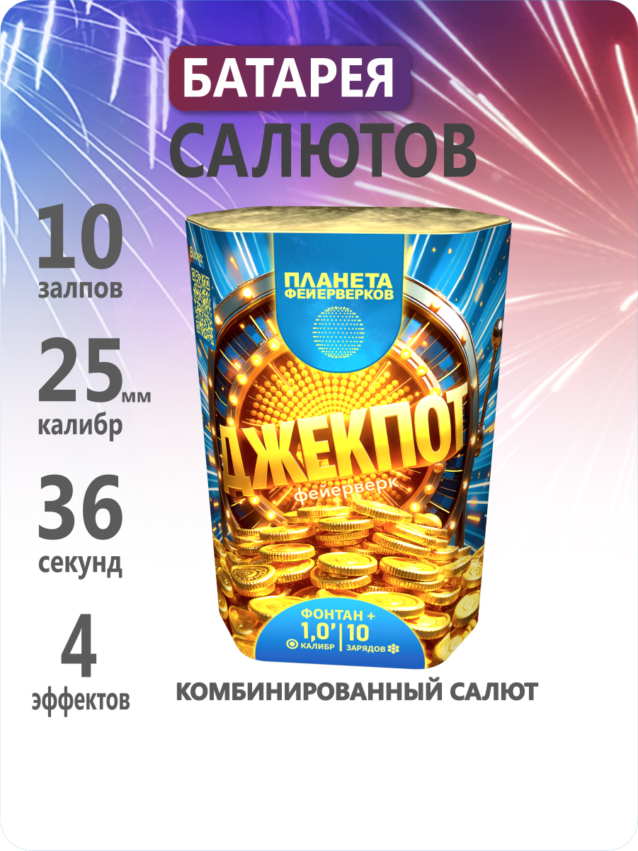 "Джекпот" - Взрыв Счастья и Удачи! Небольшой, но эффектный салют. Готовьтесь , ведь на сцену выходит "Джекпот" – комбинированный фейерверк, созданный для того, чтобы сорвать куш позитивных эмоций и незабываемых впечатлений! Это не просто салют, это настоящий "джекпот" ярких моментов, сочетающий в себе всё самое лучшее для вашего праздника. С "Джекпотом" вы не просто запускаете фейерверк, вы приглашаете удачу и радость в свою жизнь! «Джекпот» — маленькое чудо, раскрывающееся в ночном небе!